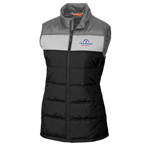Poplin, Insulated, Wind resistant, Colorblocked, Packable, Mock neck, Full zip, Front pockets, Elastic bound armholes, logo heat transfer at back yoke, Imported. Machine Wash Cold Delicate / Do Not Bleach / Tumble Dry Low, Delicate / Low Iron as Needed Farmers logo is embroidered on the left chest